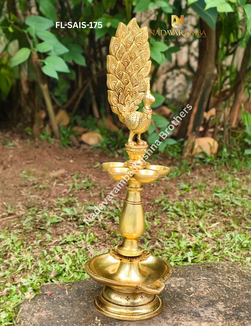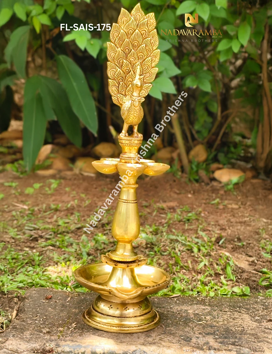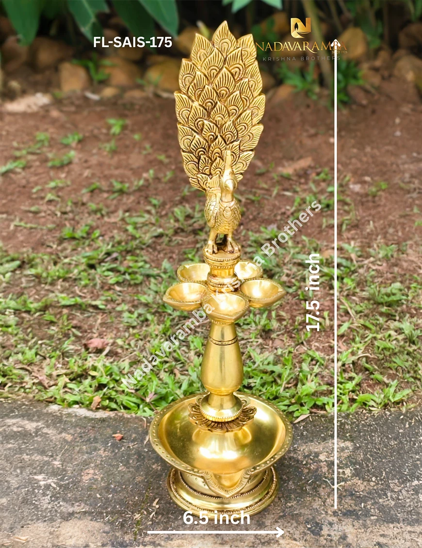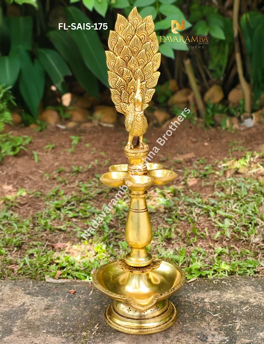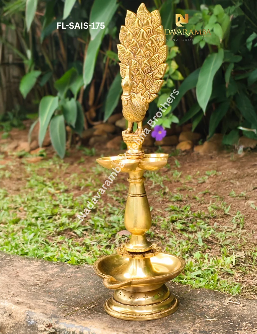 The FL-SAIS-175 is a beautifully handcrafted one-step brass fancy lamp featuring an exquisite peacock design that symbolizes grace, purity, and prosperity. Expertly made with intricate detailing and an antique finish, this elegant lamp reflects traditional Indian artistry and timeless beauty. The peacock motif atop the lamp adds a touch of grandeur, making it perfect for pooja rooms, temples, or festive décor. Ideal for lighting rituals, daily worship, or as a decorative centerpiece, it radiates divine energy and serenity. A perfect blend of devotion and craftsmanship, this lamp enhances any sacred or living space.