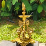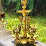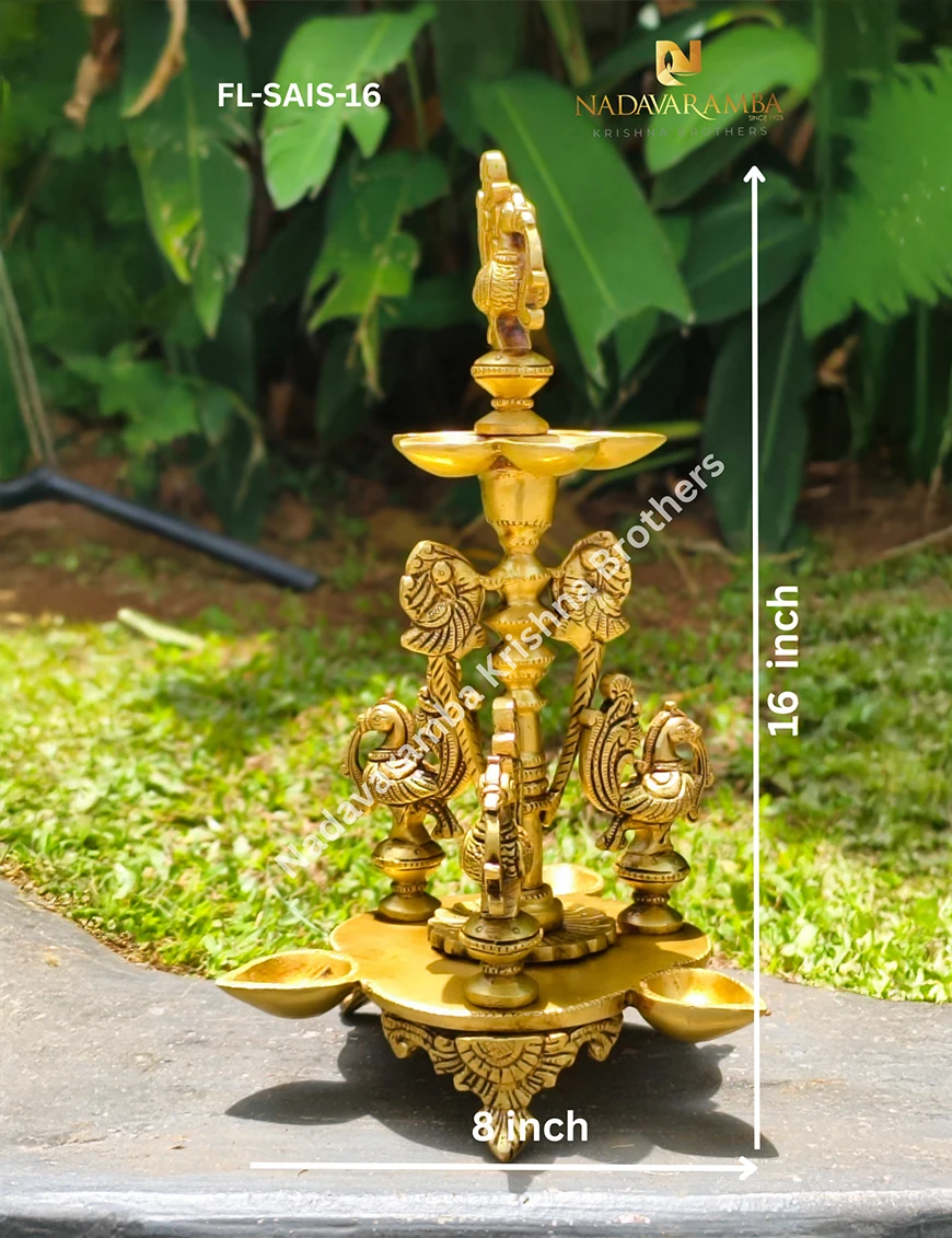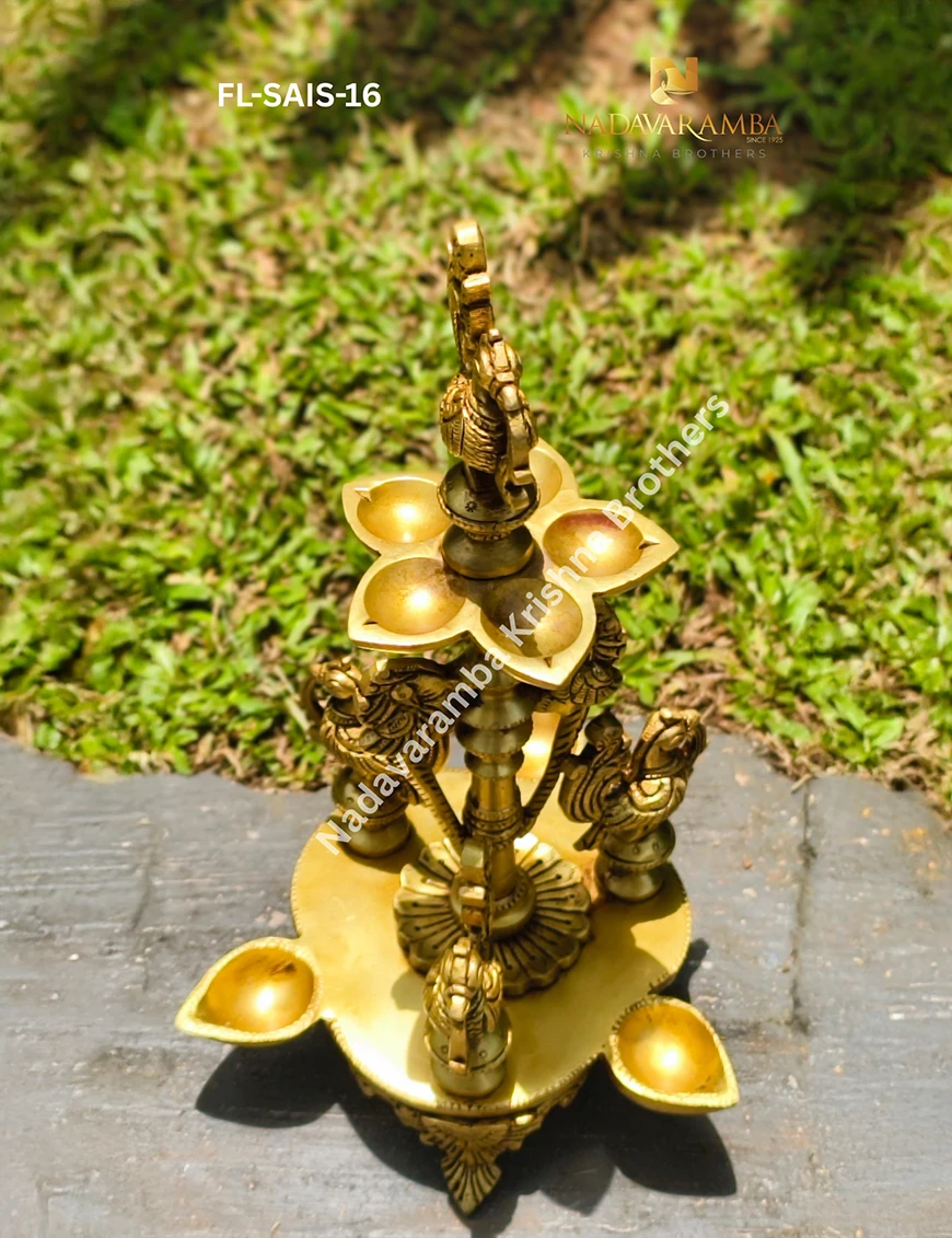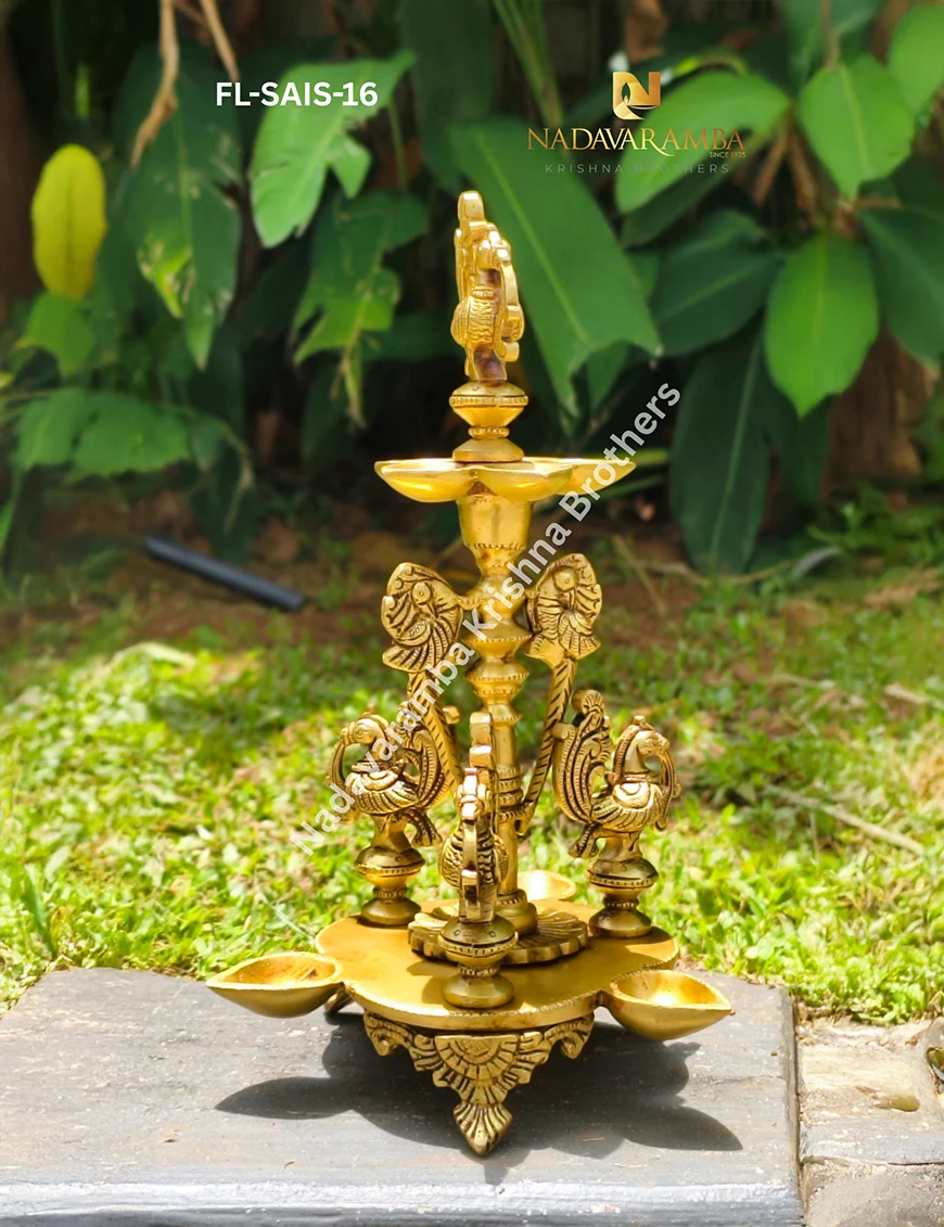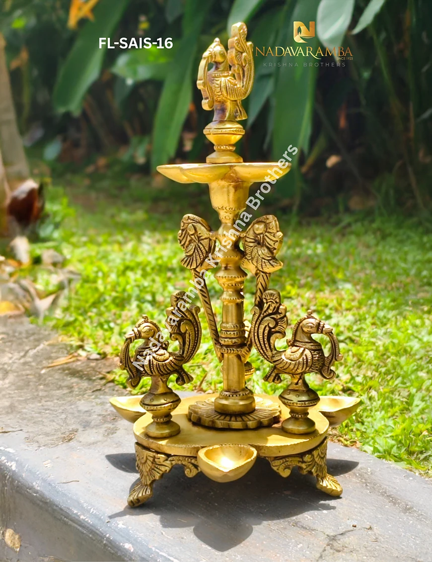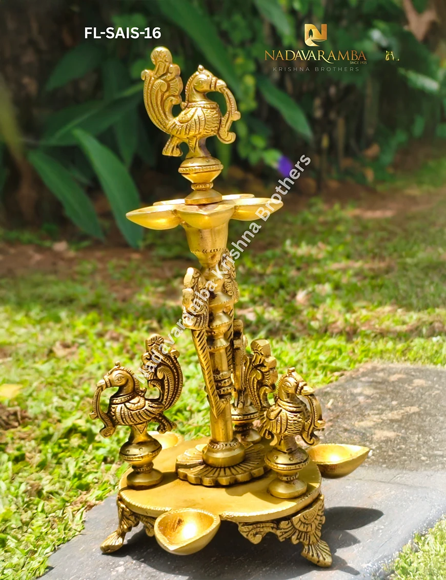 The FL-SAIS-16 is a beautifully handcrafted brass fancy lamp featuring a majestic peacock on top and a traditional five-wick base, symbolizing light, purity, and prosperity. Expertly designed with intricate carvings and an antique finish, this lamp showcases the perfect blend of divine artistry and cultural heritage. Ideal for pooja rooms, temples, or festive occasions, it radiates warmth and positive energy when lit. The elegant design and sturdy craftsmanship make it both decorative and devotional. Perfect for worship, home décor, or gifting, this lamp brings a touch of elegance and spirituality to any sacred space.