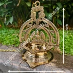 This beautiful Brass hanging Vilakku depicts the 10 avatars of Lord Vishnu on the arch of the Lamp and in centre is Lord Vishnu in Ananthasayanam. It is a mesmerizing piece of Art that will light up the room.