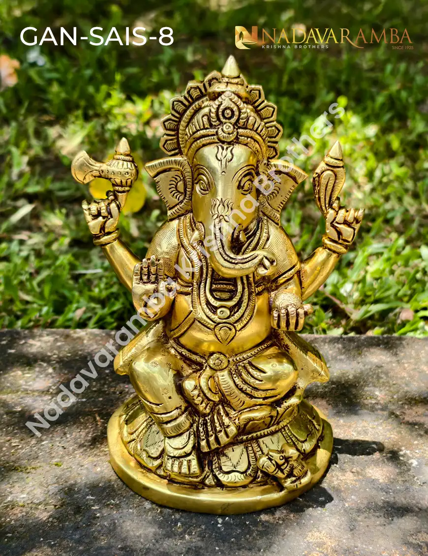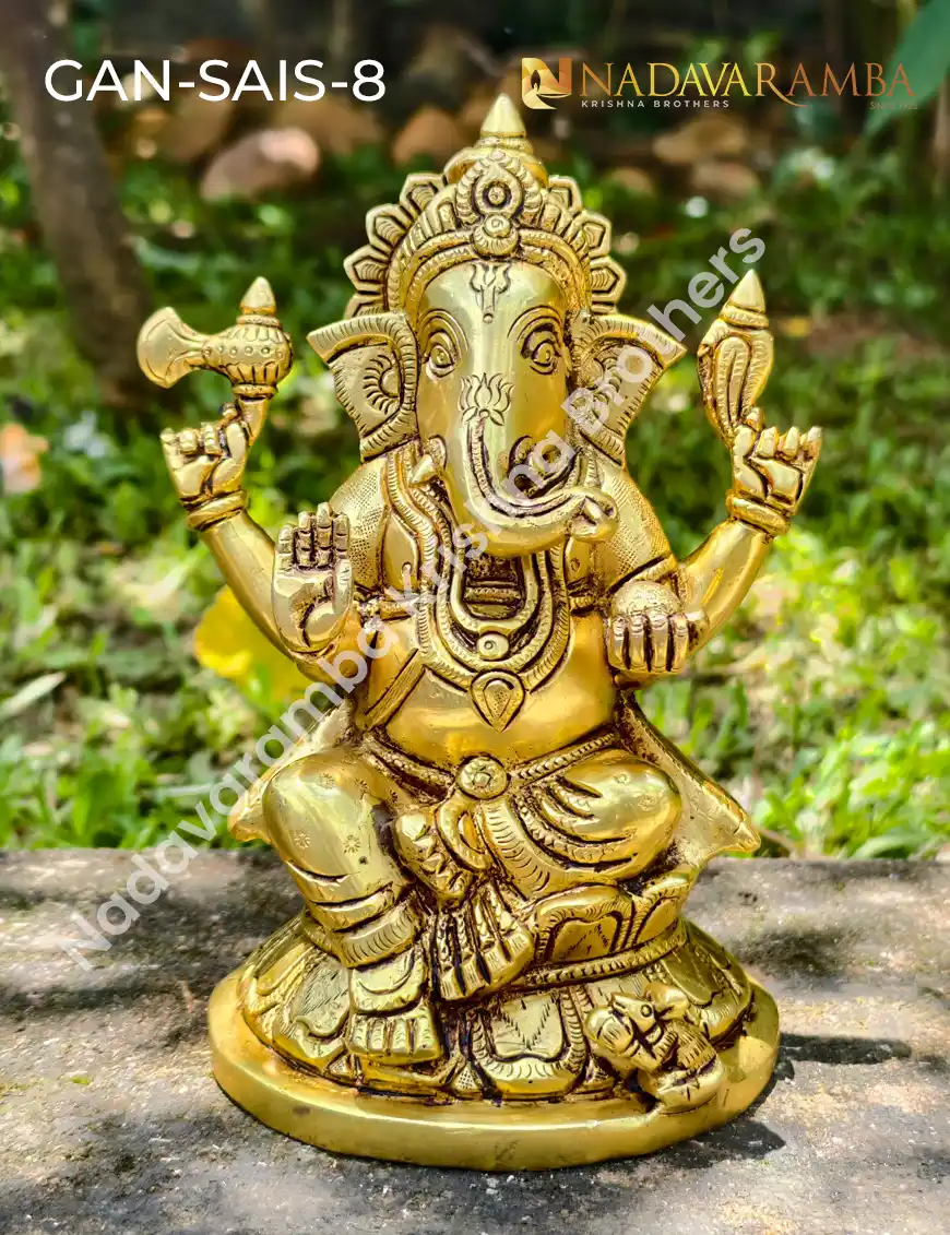 The GAN-SAIS-8 is an exquisitely handcrafted brass idol of Lord Ganesha, symbolizing wisdom, prosperity, and harmony. Designed with meticulous detailing and an elegant antique finish, this idol beautifully portrays Lord Ganesha seated in a calm and graceful posture, radiating divine energy and positivity. Expertly crafted by skilled artisans, it reflects traditional Indian artistry and devotion. Ideal for pooja rooms, temples, or as a sacred décor piece, it brings blessings and elegance to any space. Perfect for daily worship or as a meaningful gift, this idol embodies purity, grace, and timeless spiritual beauty.