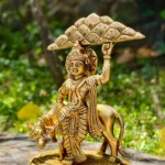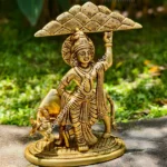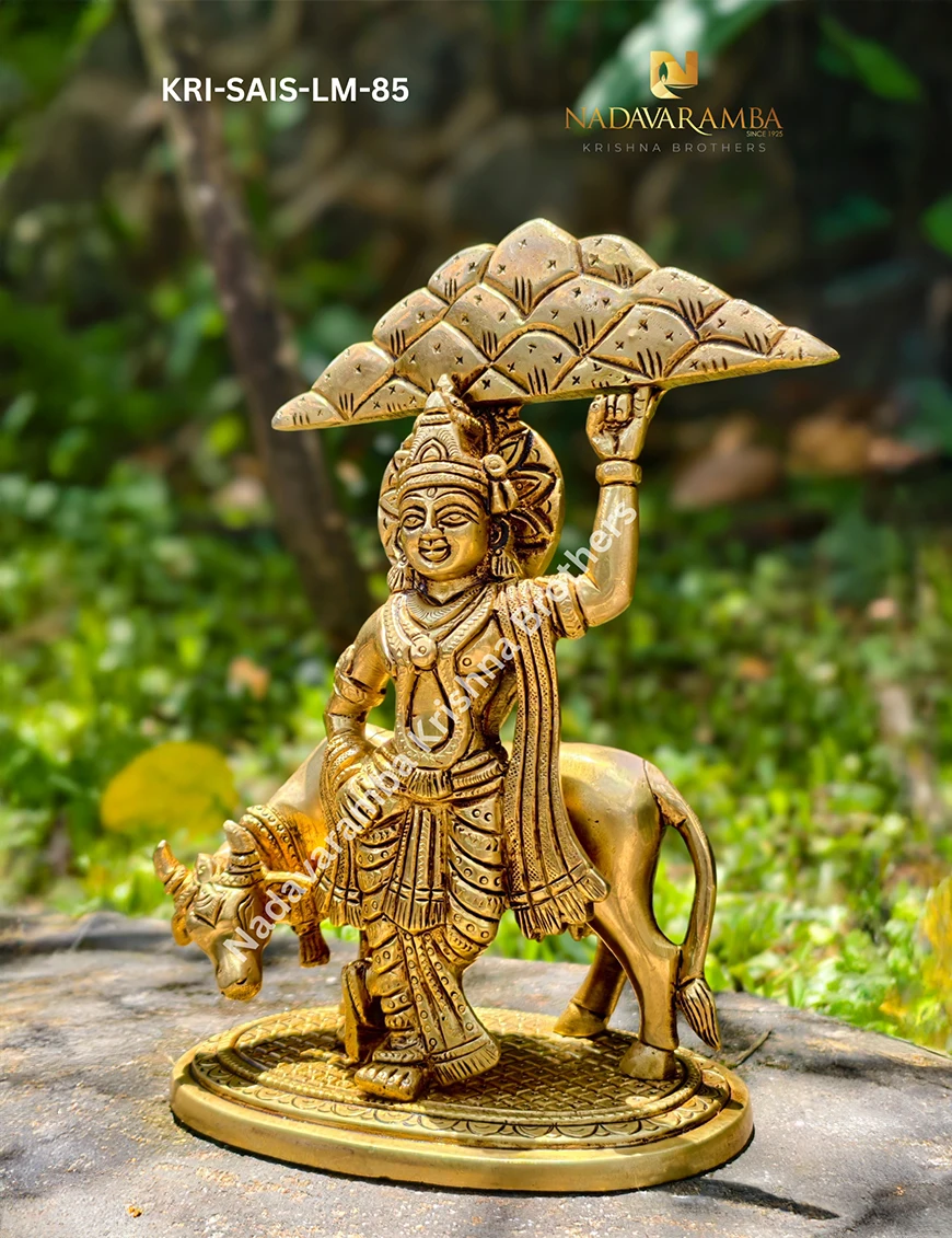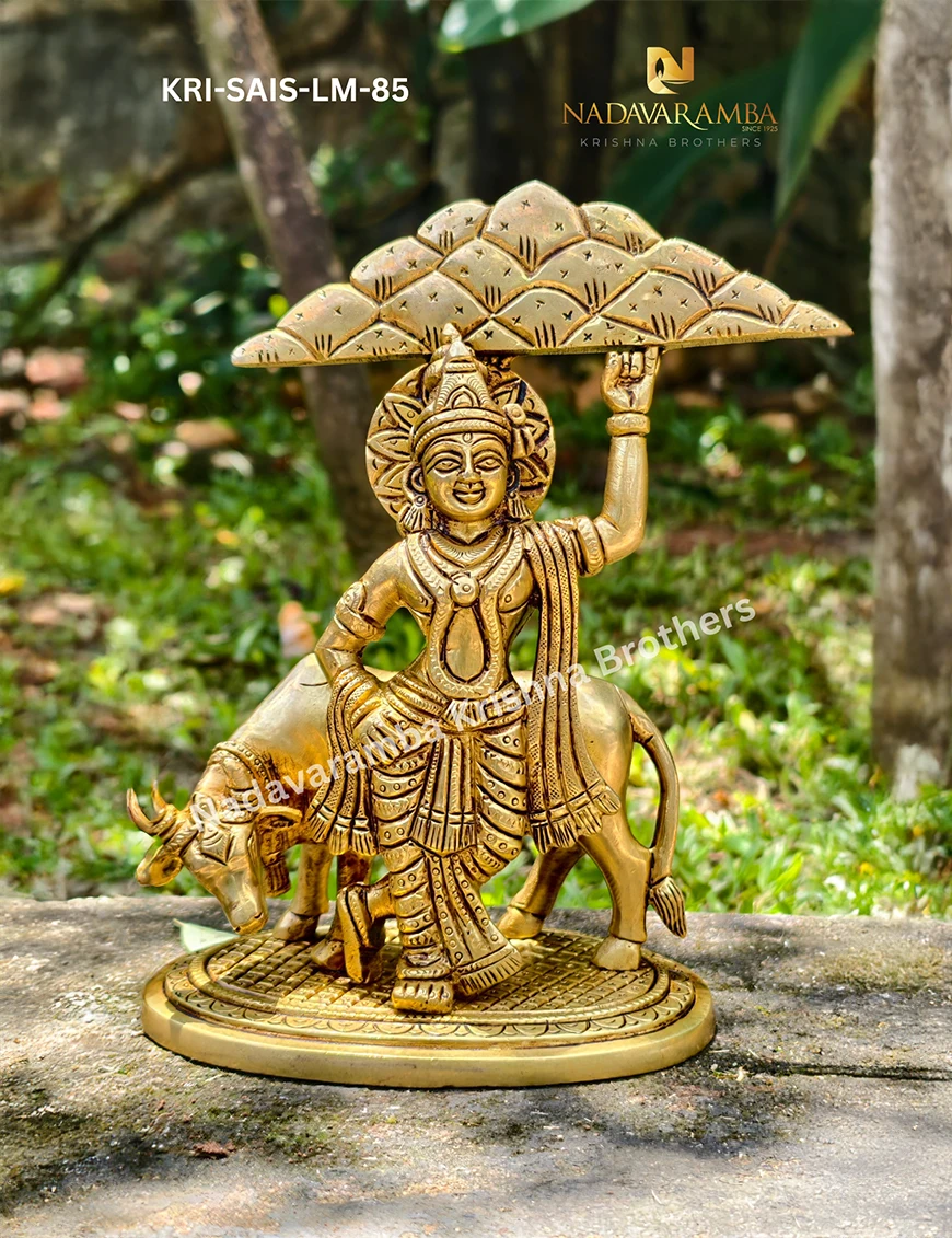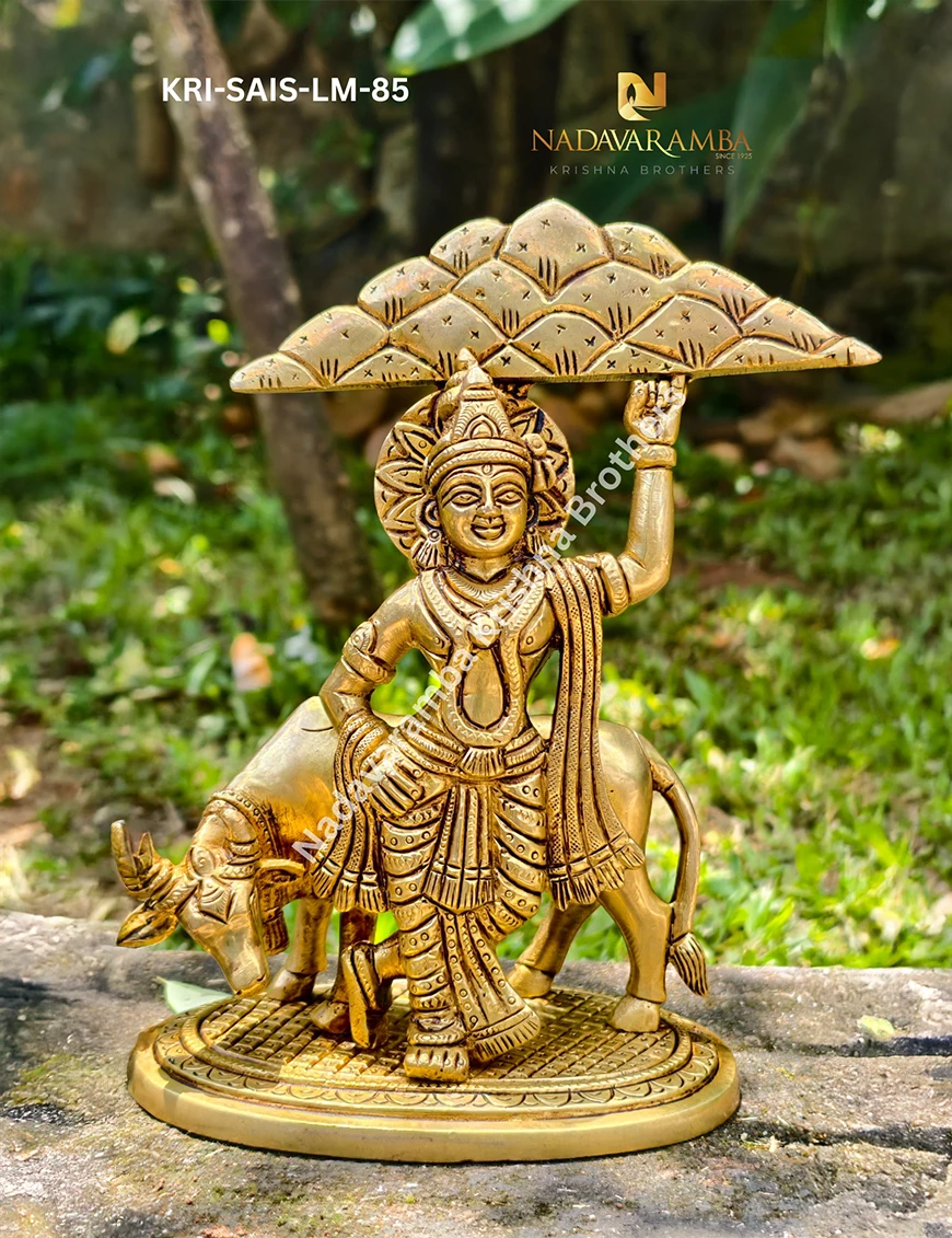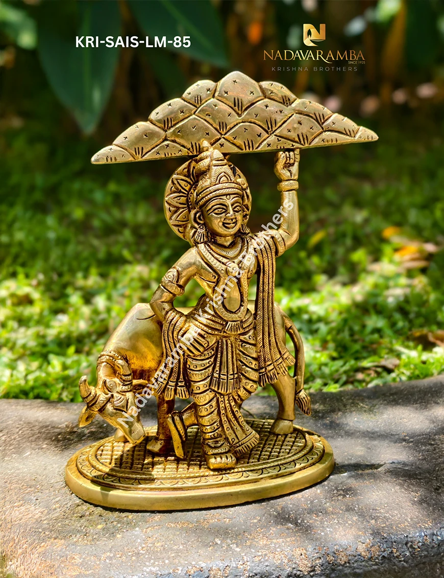 The KRI-SAIS-LM-85 is an exquisitely handcrafted brass idol of Lord Krishna lifting the Govardhan Mountain, symbolizing protection, strength, and divine grace. Beautifully detailed with an antique finish, this sculpture captures Lord Krishna’s serene expression and heroic stance as he shields his devotees. Expert craftsmanship and intricate carvings make this piece a timeless representation of devotion and artistry. Ideal for pooja rooms, temples, or elegant home décor, it radiates positivity and spiritual charm. Perfect for gifting or worship, this idol brings blessings, courage, and balance to any sacred or living space.