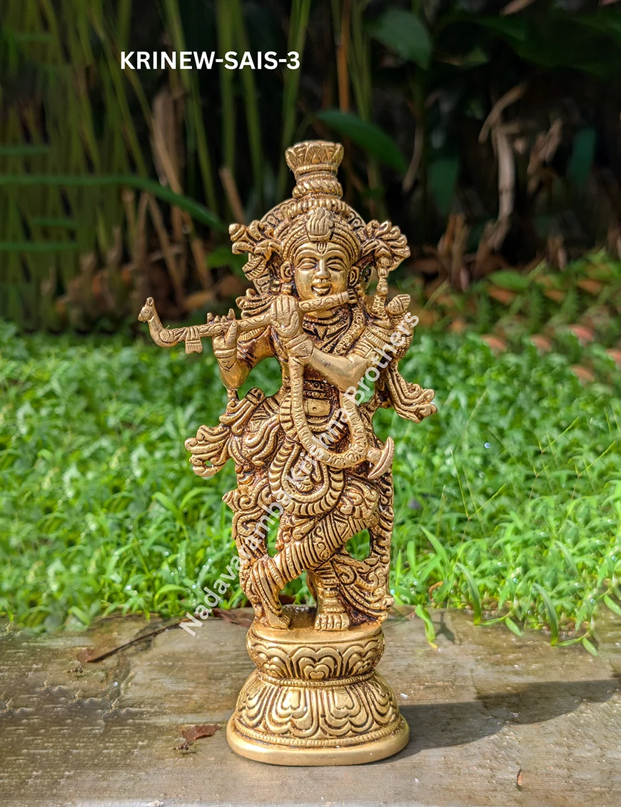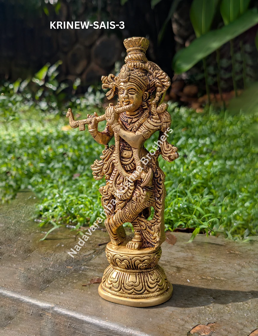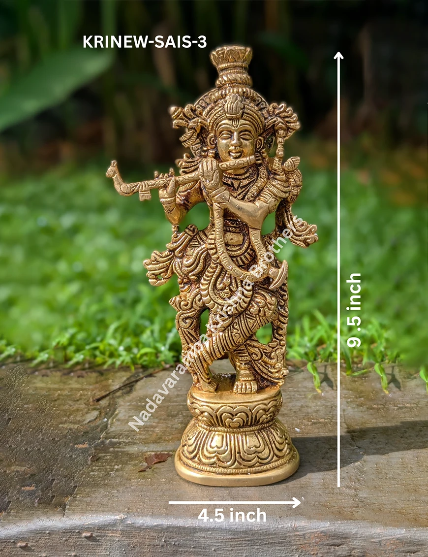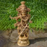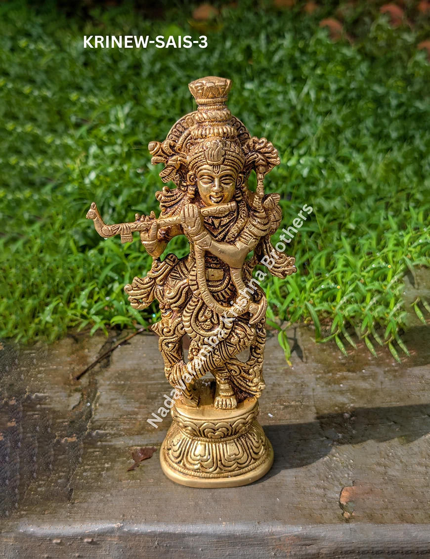 Total height – 8 inches & Width – 3 inches. Statue weighs approximately 1.15 Kg. This Lord Krishna idol is fully made out of Brass & is finished with utmost craftsmanship and is in Antique finish. This Antique finish will last long if maintained properly.