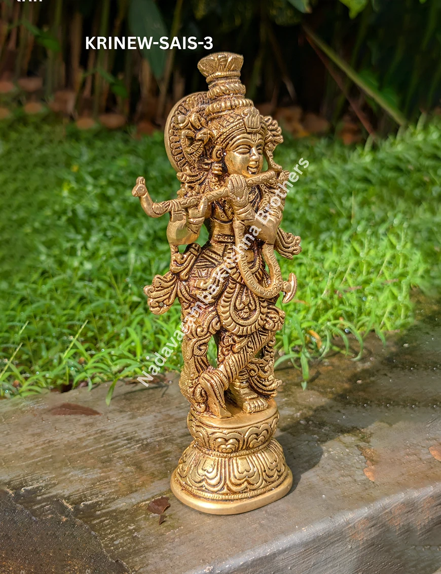 This intricately crafted Krishna idol that radiates timeless elegance and has a beautiful base with cow engraved. The detailing is a pure work of art.