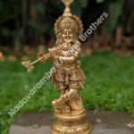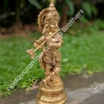 Made from high-quality brass, this new design is a testament to traditional South Indian craftsmanship, enhanced with superfine detailing across Krishna’s crown, ornaments, attire, and facial expression. The broad, circular base not only provides excellent stability but also adds a majestic presence, making it ideal for prominent display in home temples, spiritual halls, or living spaces.