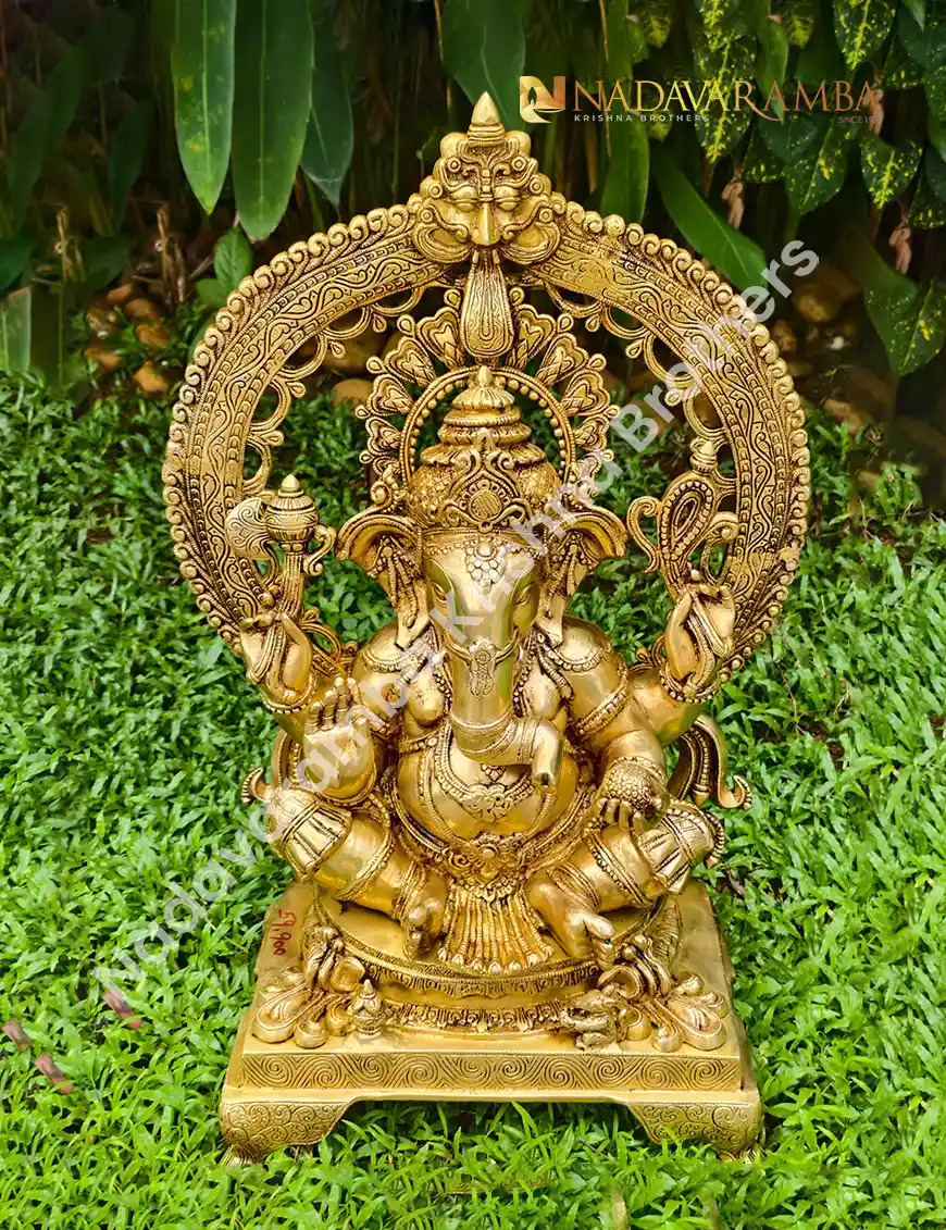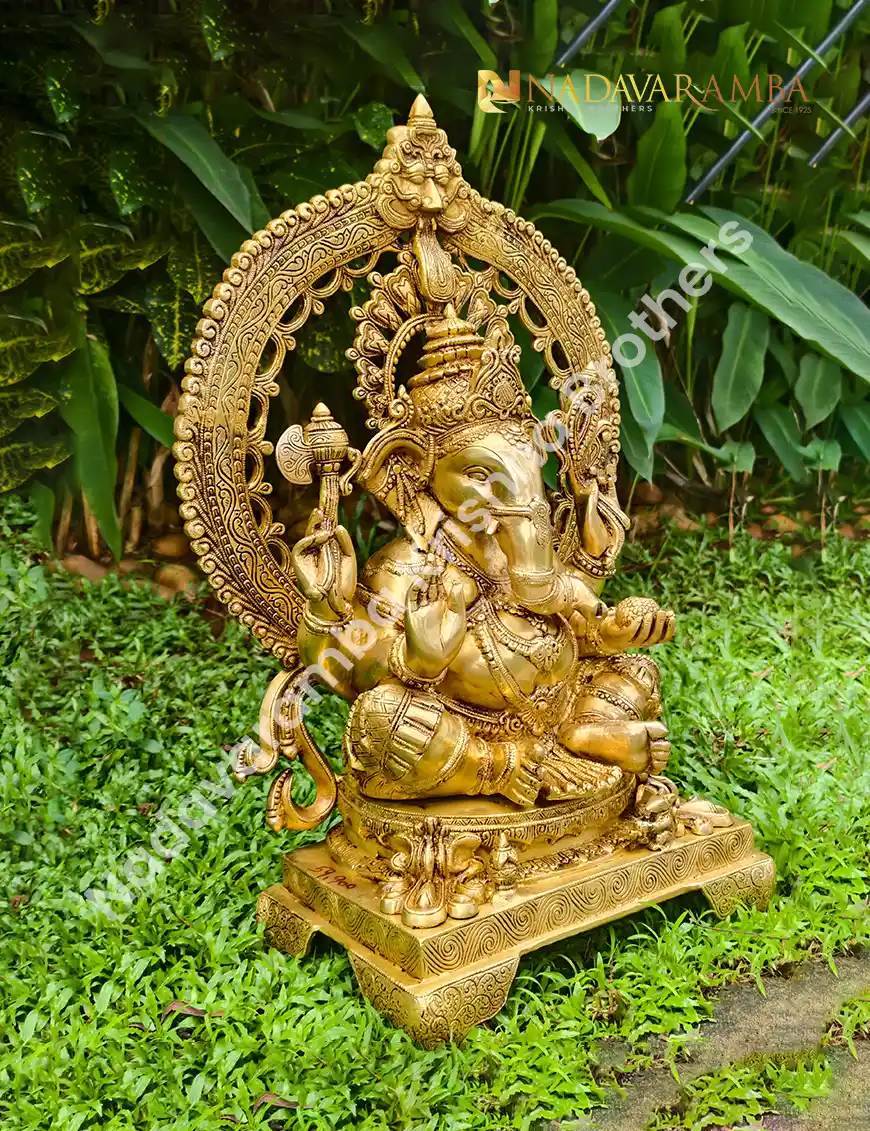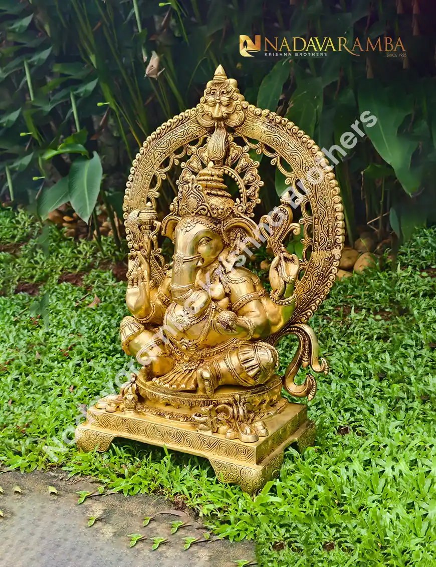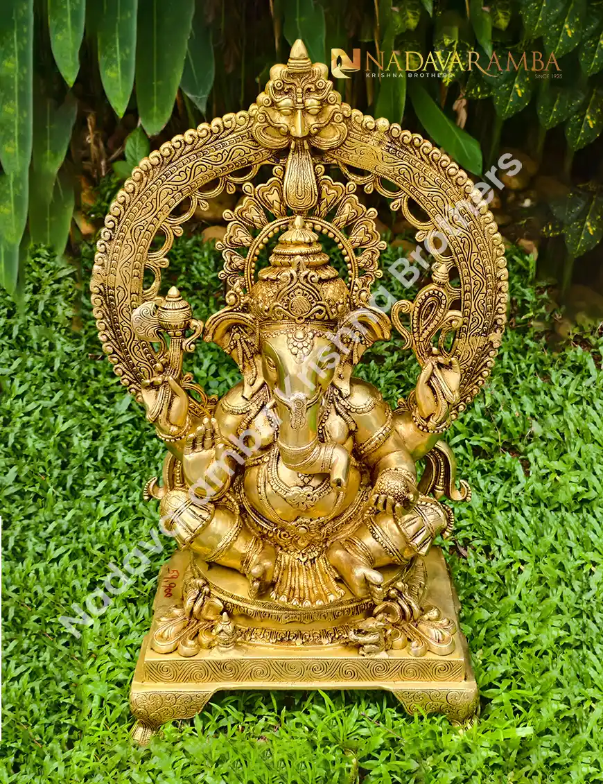 The BIGANESH-SAIS-27 is a grand handcrafted brass idol of Lord Ganesha, revered as the remover of obstacles and the embodiment of wisdom, prosperity, and auspicious beginnings. Towering with majestic presence, this masterpiece showcases intricate carvings and an exquisite antique finish that radiates divine energy and timeless elegance. Every detail—from the ornate crown to the serene posture—reflects the devotion and artistry of skilled craftsmen.