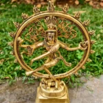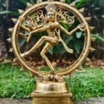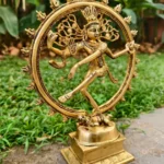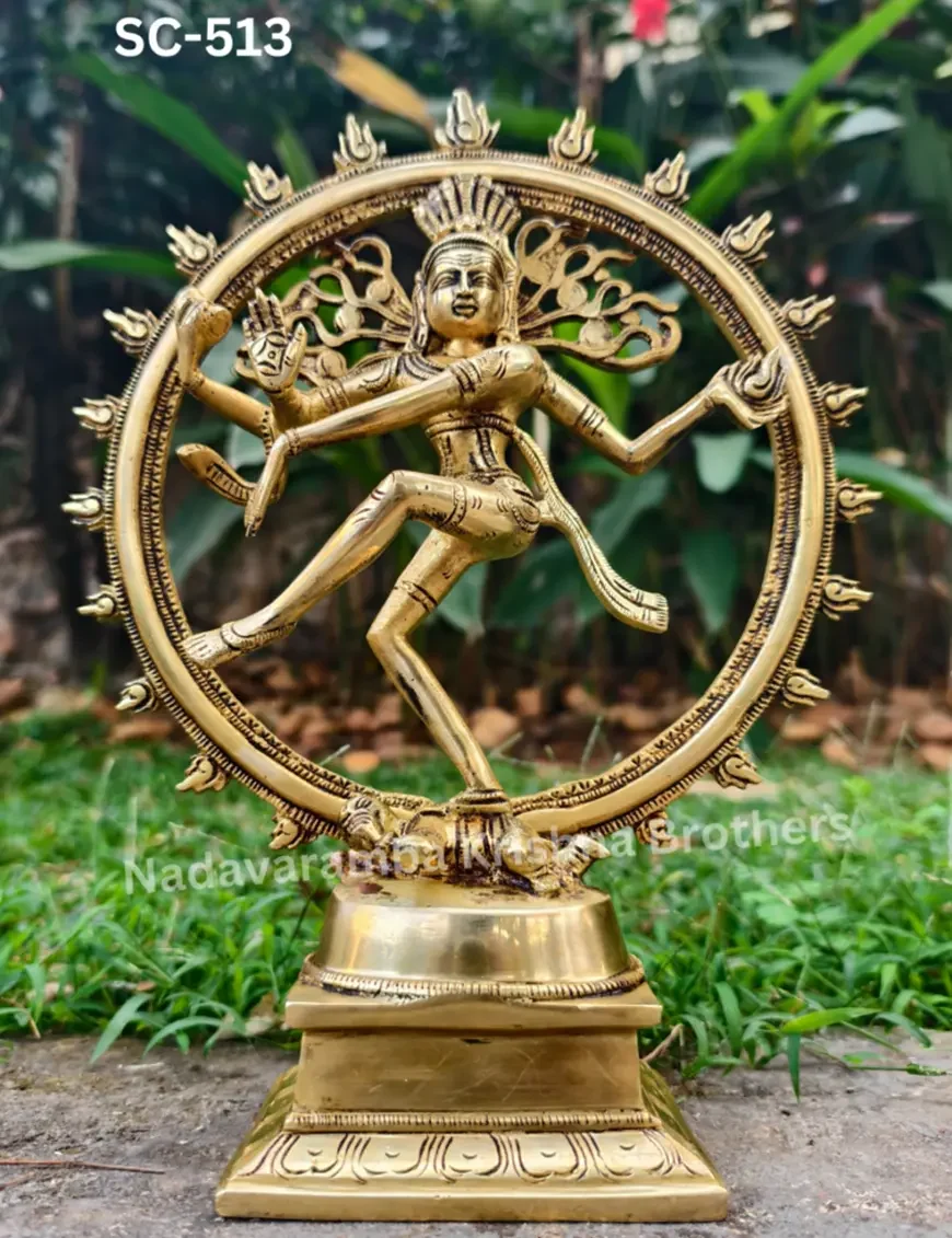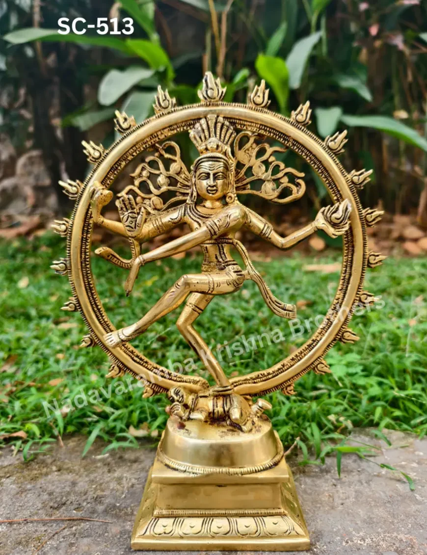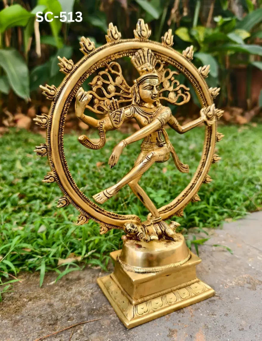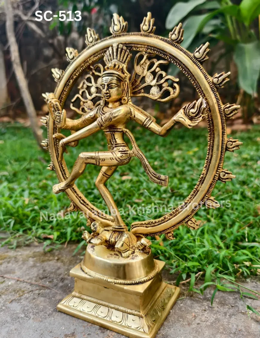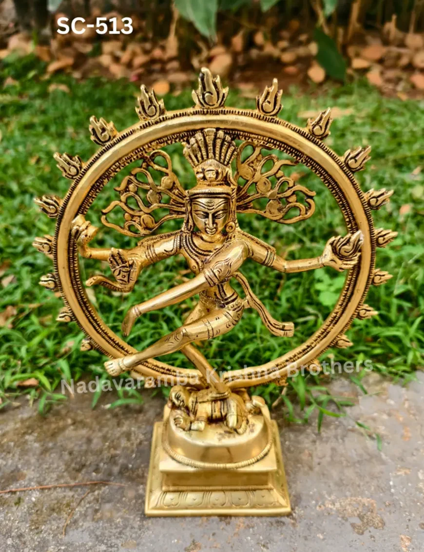 Dancing through time: Embracing the divine rhythm with this mesmerizing brass Nataraja statue. The statue is symbolic of Shiva as the lord of dance and dramatic arts. He looks calm, even through the continuous chain of creation and destruction that maintains the universe, that shows the supreme tranquility of the Atma. His legs are bent, which suggests an energetic dance. His long, matted tresses, are shown to be loose and flying out in thin strands during the dance, spread into a fan behind his head, because of the wildness and ecstasy of the dance.He dances within a circular or cyclically closed arch of flames (prabha mandala), which symbolically represent the cosmic fire that in Hindu cosmology creates everything and consumes everything, in cyclic existence or cycle of life. The fire also represents the evils, dangers, heat, warmth, light and joys of daily life. The arch of fire emerges from two makara (mythical water beasts) on each end.