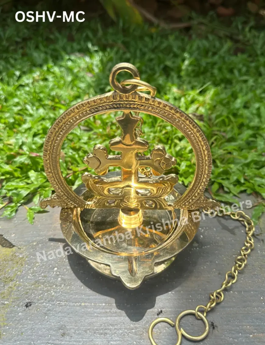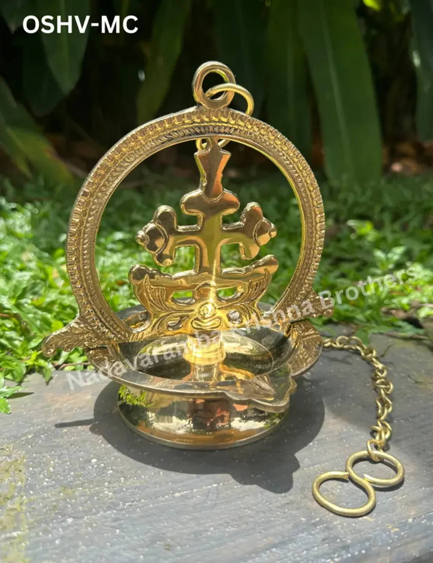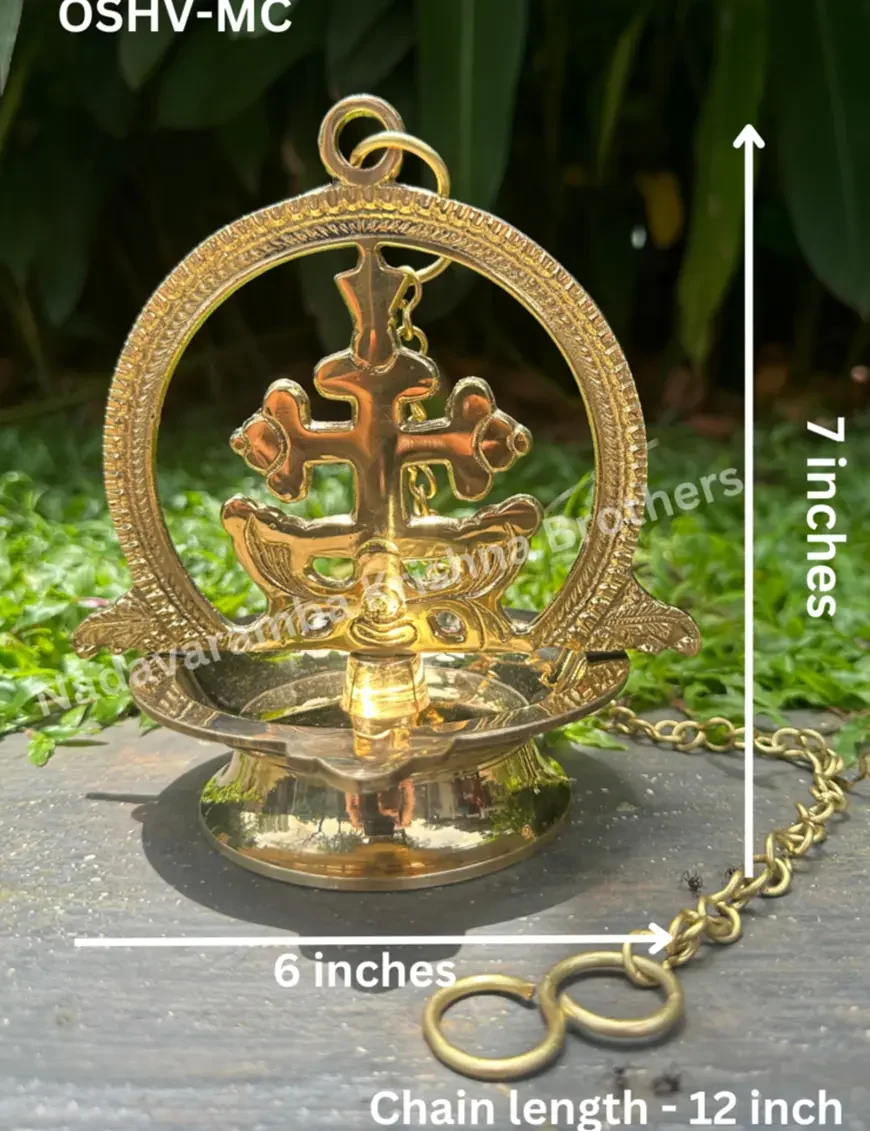 The Brass One-Side Marthoma Cross Hanging Vilakku is a unique fusion of tradition and craftsmanship, featuring a beautifully detailed Marthoma Cross on one side and a traditional oil lamp (vilakku) hanging beneath. Made from high-quality brass with a lustrous finish, this piece serves as both a spiritual symbol and a decorative element. Perfect for homes, churches, or altars, it adds a serene ambiance with its soft, glowing light. This hanging vilakku is ideal for those seeking to enhance their prayer space or as a thoughtful, faith-inspired gift.
