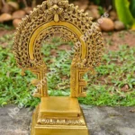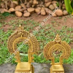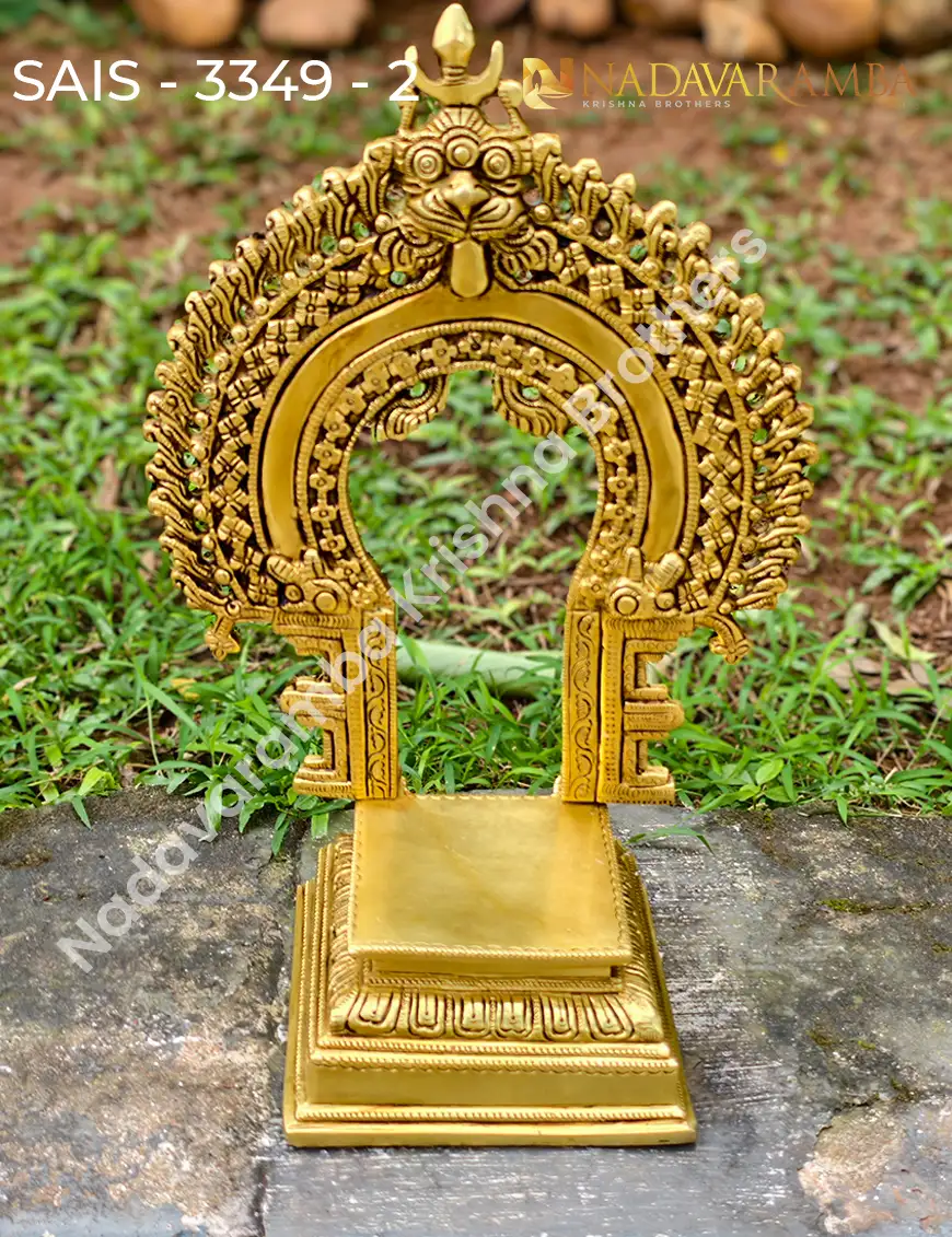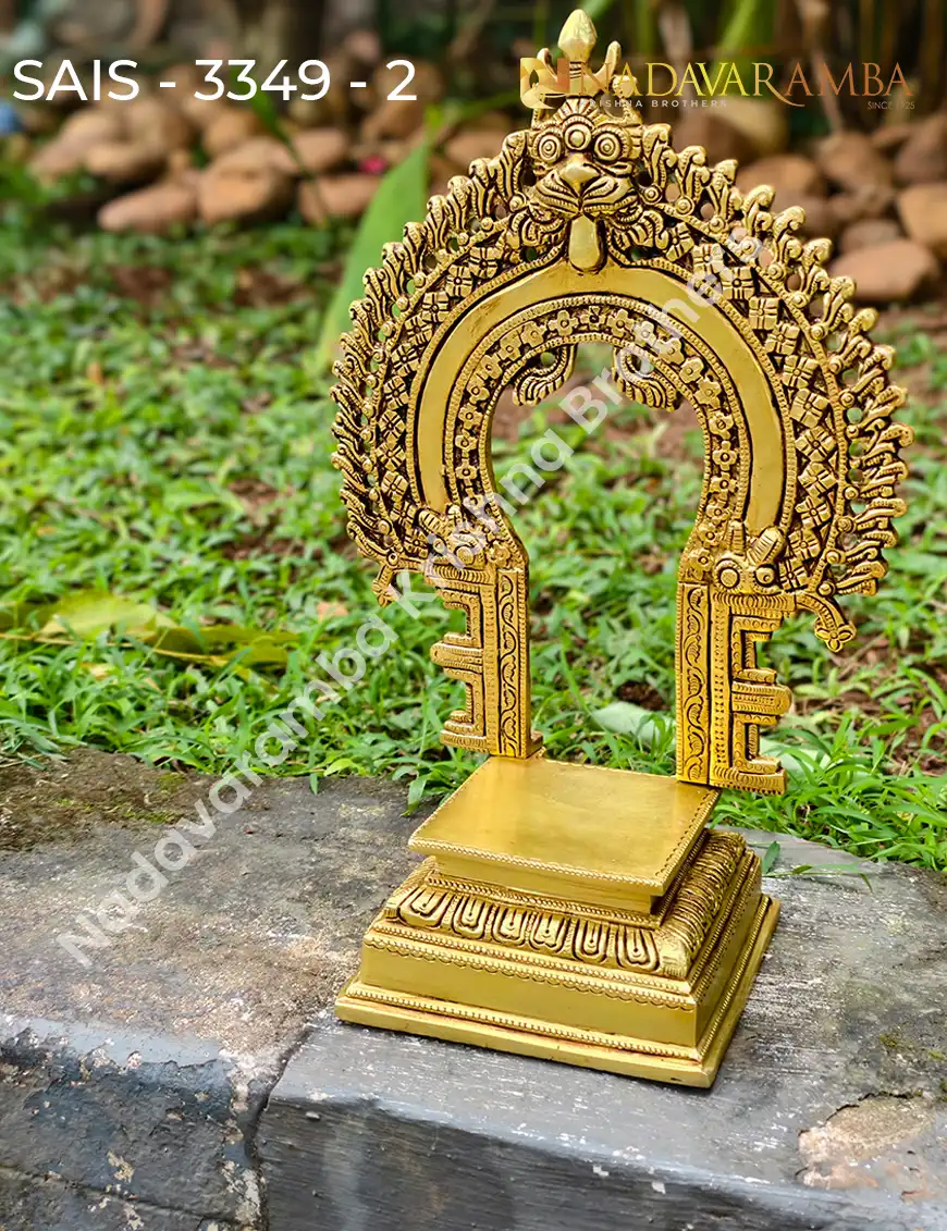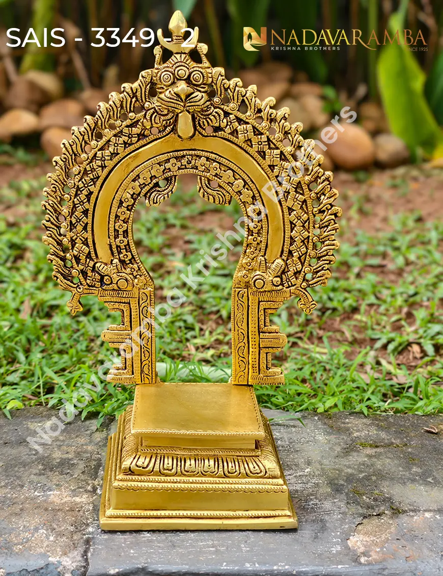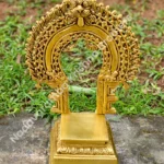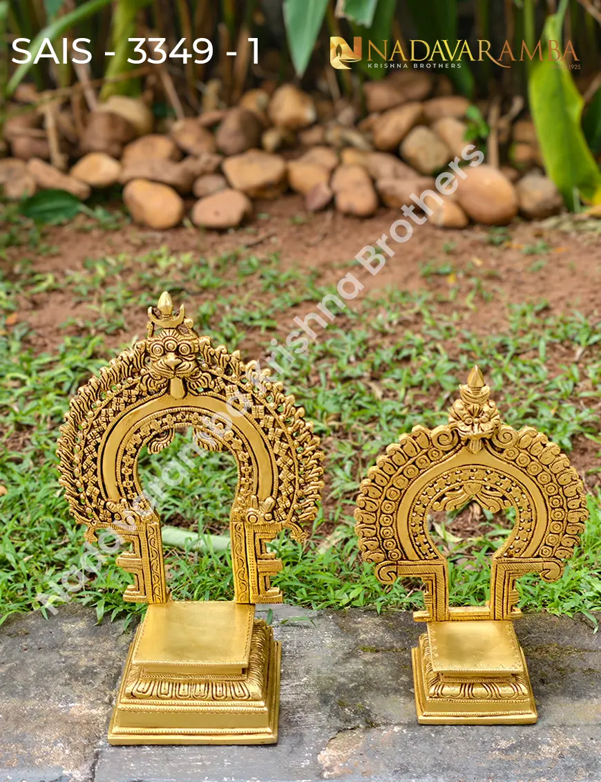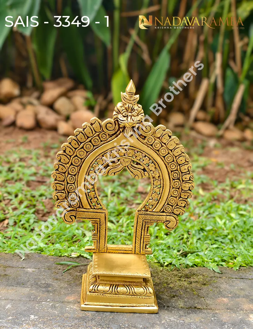The Prabha Peedam with Base (SAIS-3349) is a beautifully crafted traditional backdrop designed to enhance the divine presence of idols in pooja spaces. Featuring a classic prabha (aura) design with a sturdy base, it symbolizes radiance and spiritual elegance, making it a perfect addition to home altars and temple setups.