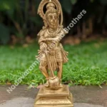 The Brass statue depicts Lord Murugan also known as Karthikeyan holding a Vel and sitting on a beautiful peacock. The statue weighs about 1.43 Kg, it is 6 inches in height and 3.5 inches wide in width. Kartikeya, also known as Skanda, Subrahmanya, Shanmukha and Murugan, is the Hindu god of war. Lord Murugan is a powerful Hindu deity who is the son of lord Shiva and goddesses Parvathi. Lord Murugan is the younger brother of lord Ganesha. Bring home this exquisitely handcrafted brass masterpiece and be blessed with courage and protection.