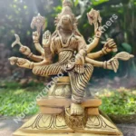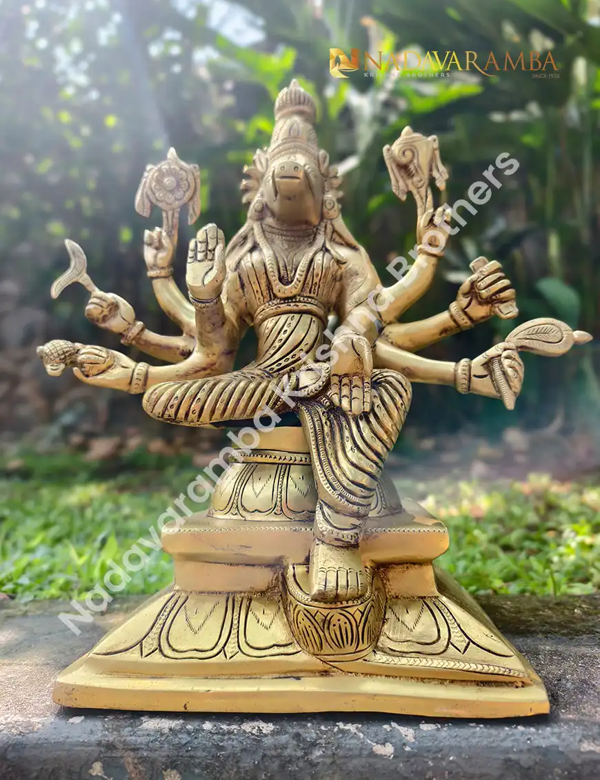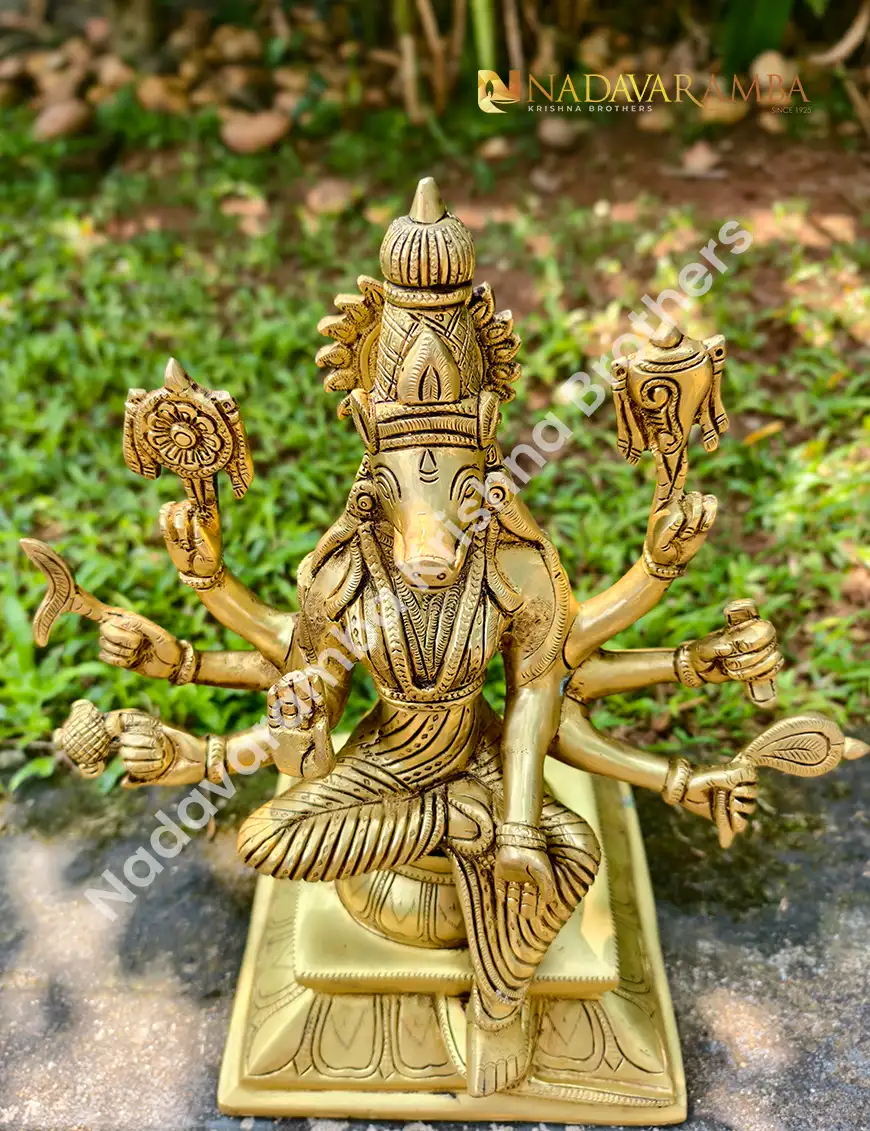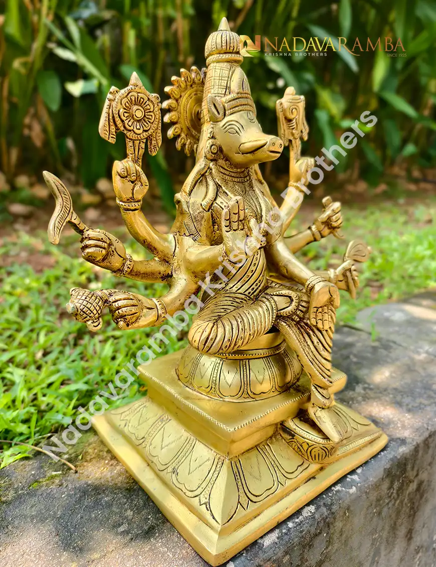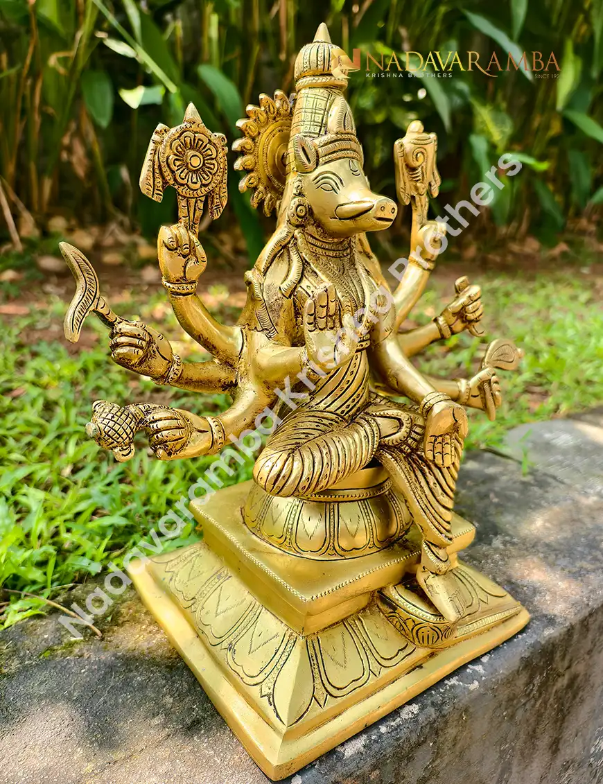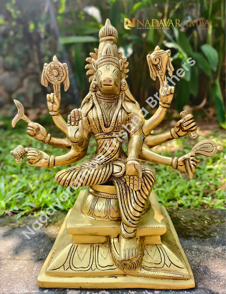 The VARAHI-AMH-BIG is a grand handcrafted brass idol of Goddess Varahi, revered as one of the Sapta Matrikas and a powerful embodiment of protection, courage, and divine strength. Designed with a sturdy square base, this masterpiece radiates unmatched spiritual energy and traditional elegance. Finished in an exquisite antique polish, every detail—from the divine posture to the intricate carvings—reflects the devotion and artistry of skilled craftsmen.