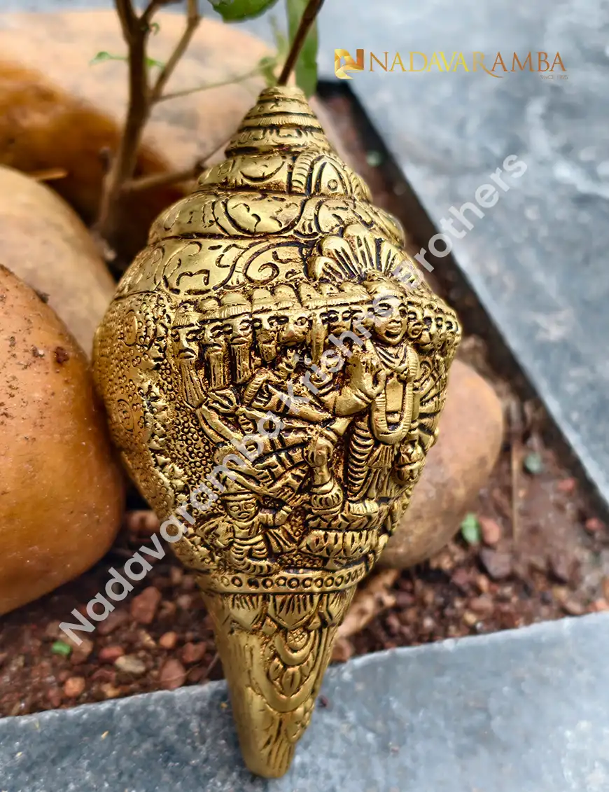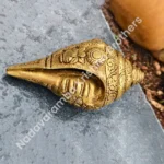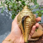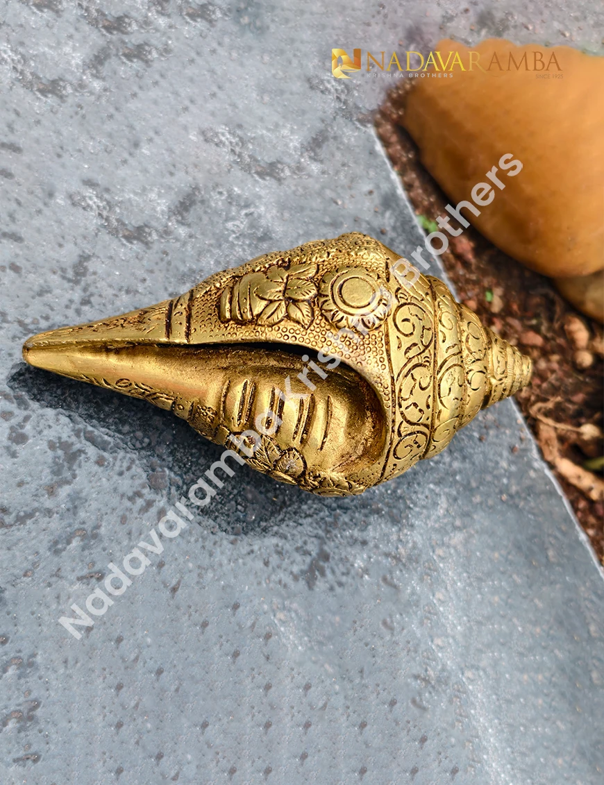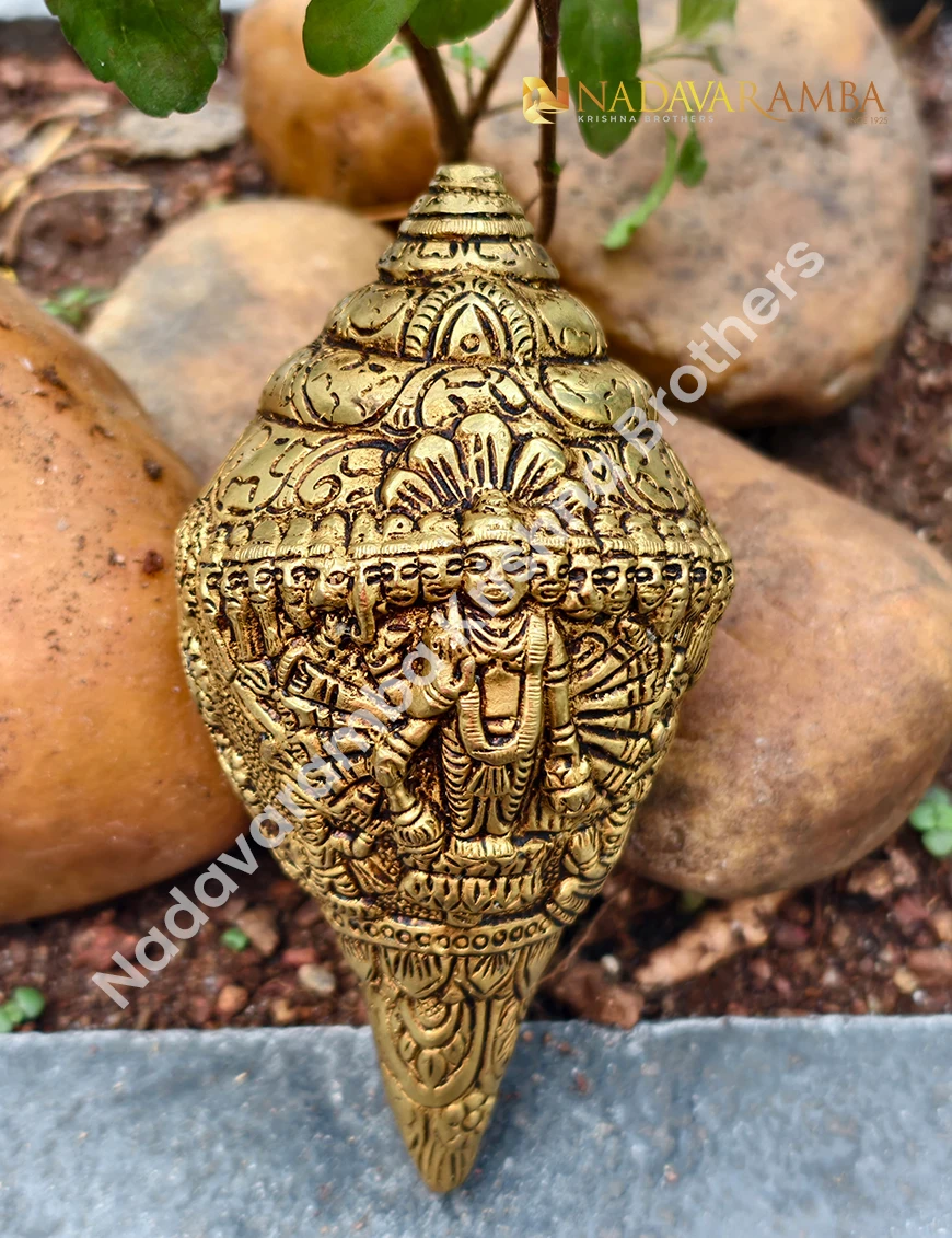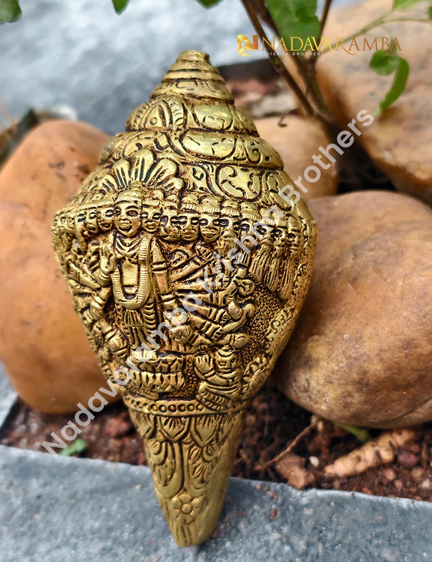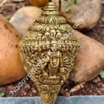 The VISH-SHANK-S is a finely handcrafted brass Shanku (conch), designed in the divine Vishwaroopam style. Compact yet exquisitely detailed, this sacred piece symbolizes purity, auspiciousness, and spiritual energy. Finished in an antique polish, it reflects the devotion and artistry of skilled craftsmen, making it a timeless treasure for your sacred or decorative space.
